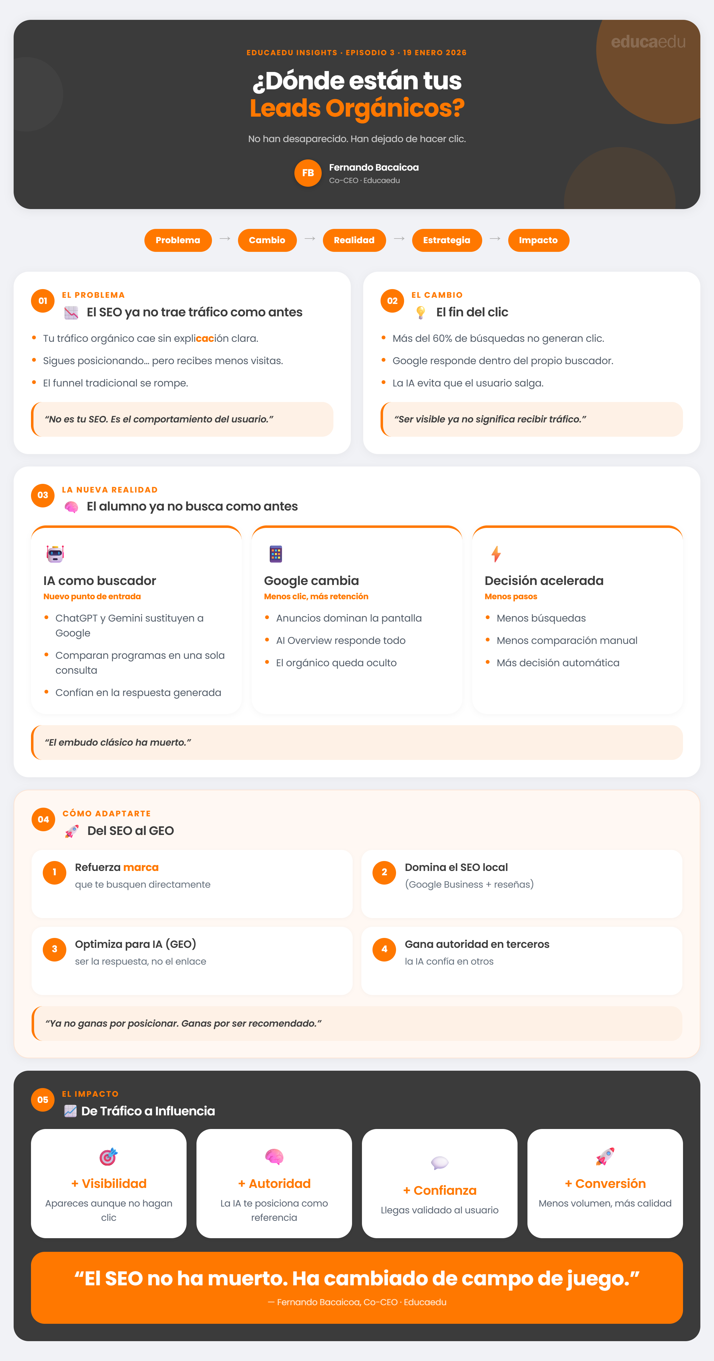El mensaje no es que el SEO haya muerto, sino que se ha vuelto una disciplina quirúrgica. Ya no es suficiente con publicar contenido y esperar; debemos elevar nuestra visión estratégica, potenciar nuestra marca y aplicar técnicas de GEO para asegurar que, cuando un alumno pregunte a una IA, nuestra institución sea la respuesta recomendada.