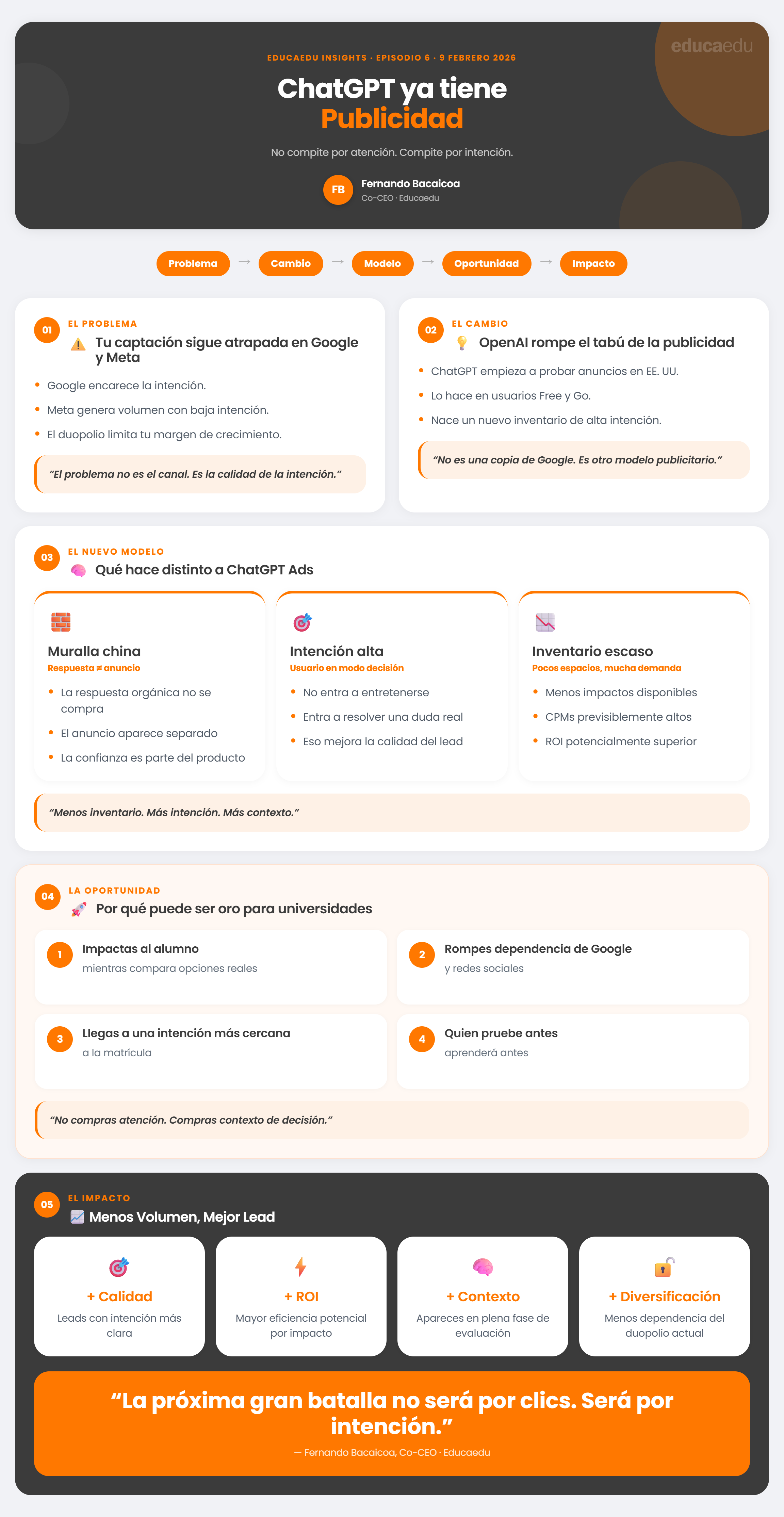 • Intención vs. Tiempo: A diferencia de las redes sociales (que buscan retener al usuario), ChatGPT apuesta por la utilidad rápida. Su objetivo no es retener al alumno sino dar respuestas de calidad, lo que sugiere que los leads generados en ChatGPT podrían ser de mayor calidad.